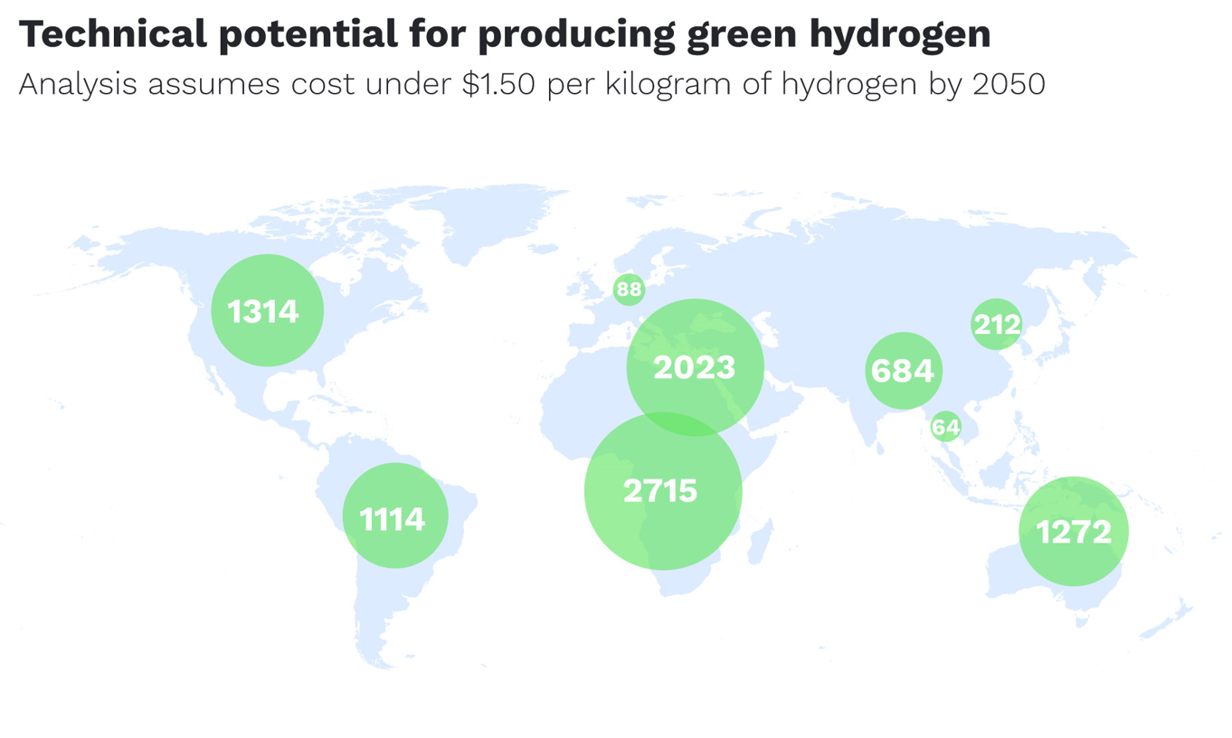 The map above outlines the global potential for producing green hydrogen for less than $1.50 per kilogram by 2050.
