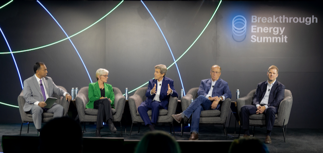 Vijay Vaitheeswaran with The Economist moderates a panel with Jennifer Granholm, U.S. Energy Secretary, John Kerry, U.S. Special Presidential Envoy for Climate, Larry Fink CEO of BlackRock, and Christoph Schweizer, CEO of Boston Consulting Group at the Breakthrough Energy Summit.